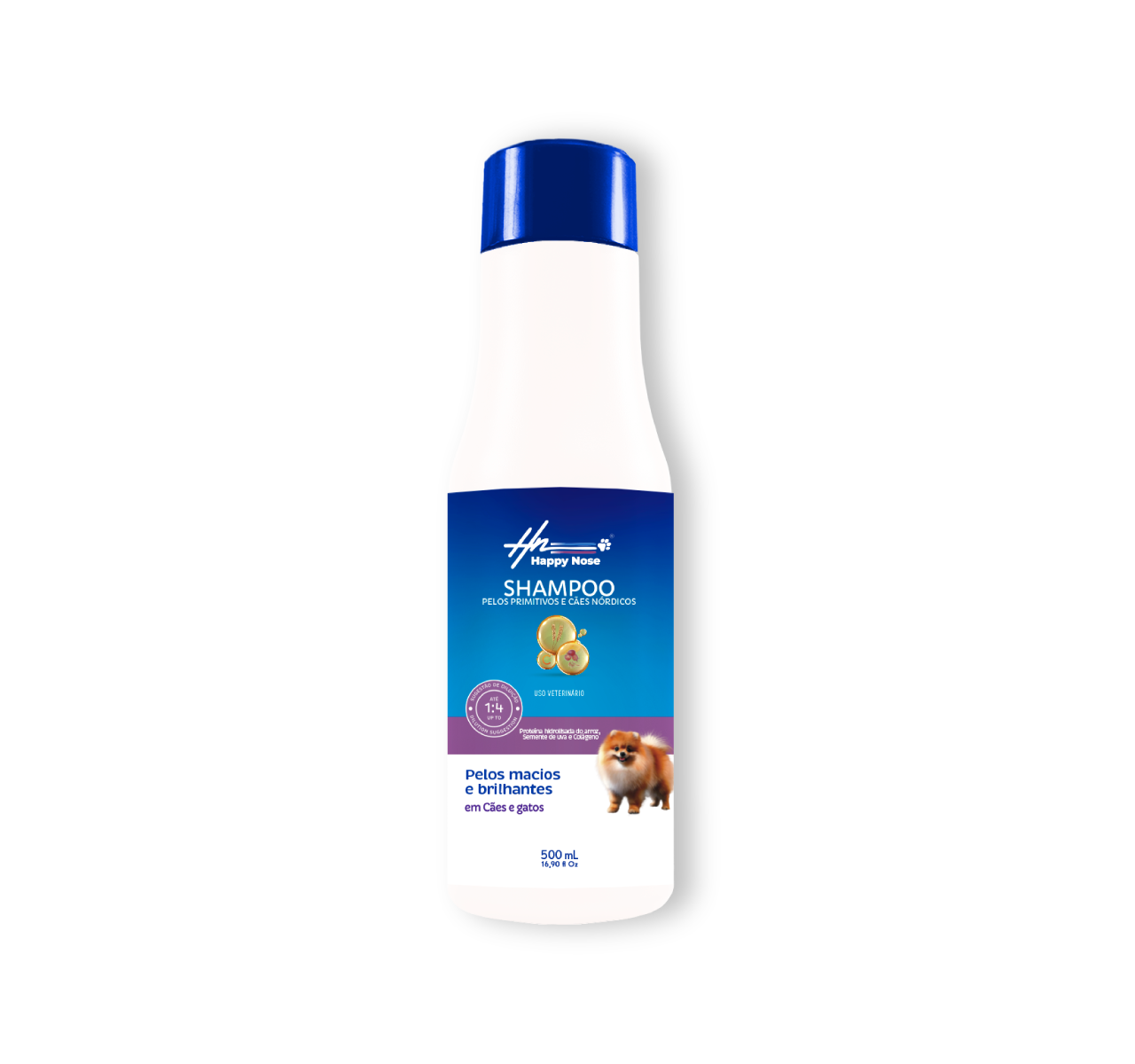 Shampoo Pelos Primitivos e Cães Nórdicos Happy Nose Linha Premium. É indicado para o cuidado do pelo que necessita de nutrientes que restauram a camada queratinizada. O pelo é formado por proteínas, as proteínas, por sua vez, são formadas por polímeros de aminoácidos com uma sequência de distribuição e composição próprias para cada proteína. Para se obter um tratamento completo, são necessárias combinações de diversas proteínas para repor os nutrientes perdidos. Com isto, a combinação das Proteínas do Trigo, Soja, Leite, seda e Quinoa, associada com Extrato de Aveia e Creatina é a junção perfeita para pelos reestruturados, macios e com muito brilho. Ideal para efeito Fluffy.
