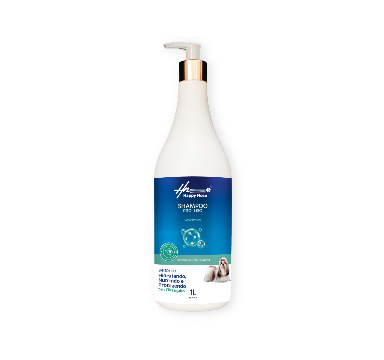 Shampoo Pro Liso Happy Nose Linha Premium. Com Blend que confere hidratação e mantém a pelagem com efeito liso. Rico em polímero de algas, Poliquatérnio e silicone. Age fornecendo nutrientes, neutralizando a carga eletrostática, condicionando e reduzindo o volume. Formação de filme hidratante, protetor, permeável. Não mascara o fio.COMPOSIÇÃO: Água Purificada, EDTA, Hidroxietilcelulose, Lauril Éter Sulfato de sódio, Glicerina Bidestilada, Amida 90, Blend (Polímero de Algas, Poliquatérnio e Silicone), Poliquaternario7, Conservante Metilcloroisotiazolinona (E) Metilisotiazolinona, Ácido Cítrico, Essência Baby.INDICAÇÃO: Usar o Shampoo Pelos Lisos Happy Nose Linha Premium, em cães e gatos, com idade acima de 2 meses. Todas as Raças. Porte: Mini, Pequeno, Médio, Grande e Gigante.MODO DE USAR: Molhar o animal e aplicar o Shampoo Pro Liso Happy Nose Linha Premium. Aplique sobre a pelagem molhada e massageie. Distribuindo uniformemente por todo o corpo, principalmente nas partes com pelos mais longos, friccionar até obter uma espuma homogênea. Enxaguar com abundância. Caso necessário, reaplicar o produto. Para um resultado perfeito, finalize com a Máscara Pro Liso Happy Nose Linha Premium. A concentração permite que seja diluído 1 parte do produto para 10 partes de água.CUIDADOS: Utilizar água potável para a diluição e fazer uso em até 24 horas. Evitar o contato do produto com os olhos, boca e focinho do animal. Caso isso ocorra, lavar com água em abundância. Procurar um médico veterinário, caso ocorra uma irritação ocular persistente. Conservar o produto em temperatura ambiente (15-30ºC) ao abrigo da luz solar e da umidade, fora do alcance de crianças e animais domésticos.