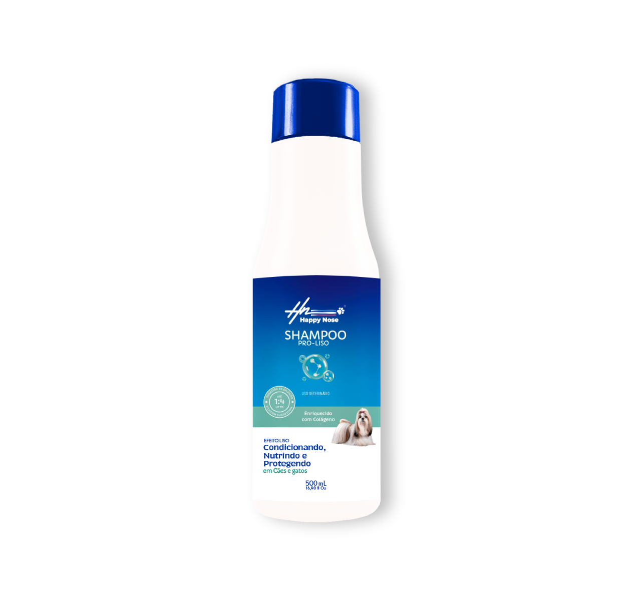 Shampoo Pro Liso Happy Nose Linha Premium. Com Blend que confere hidratação e mantém a pelagem com efeito liso. Rico em polímero de algas, Poliquatérnio e silicone. Age fornecendo nutrientes, neutralizando a carga eletrostática, condicionando e reduzindo o volume. Formação de filme hidratante, protetor, permeável. Não mascara o fio.
